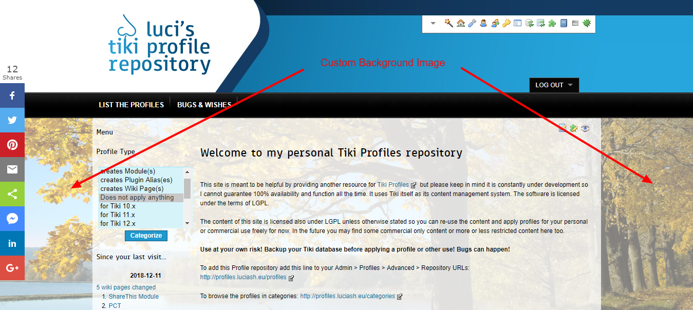 To add this Profile repository to your Tiki add the line below to your Admin (Control Panels) → "Profiles" → "Advanced" tab → "Repository URLs" text area:https://profiles.luciash.eu/profiles